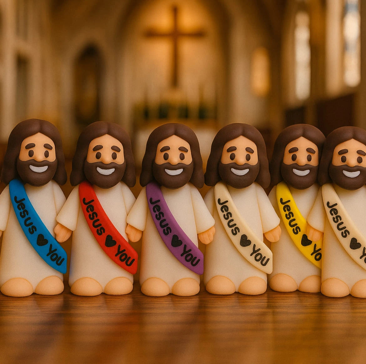 Cada pack incluye figuras con diferentes colores de banda (azul, roja, morada, amarilla y crema). Todas transmiten el mismo mensaje: “Jesus ❤️ You”.